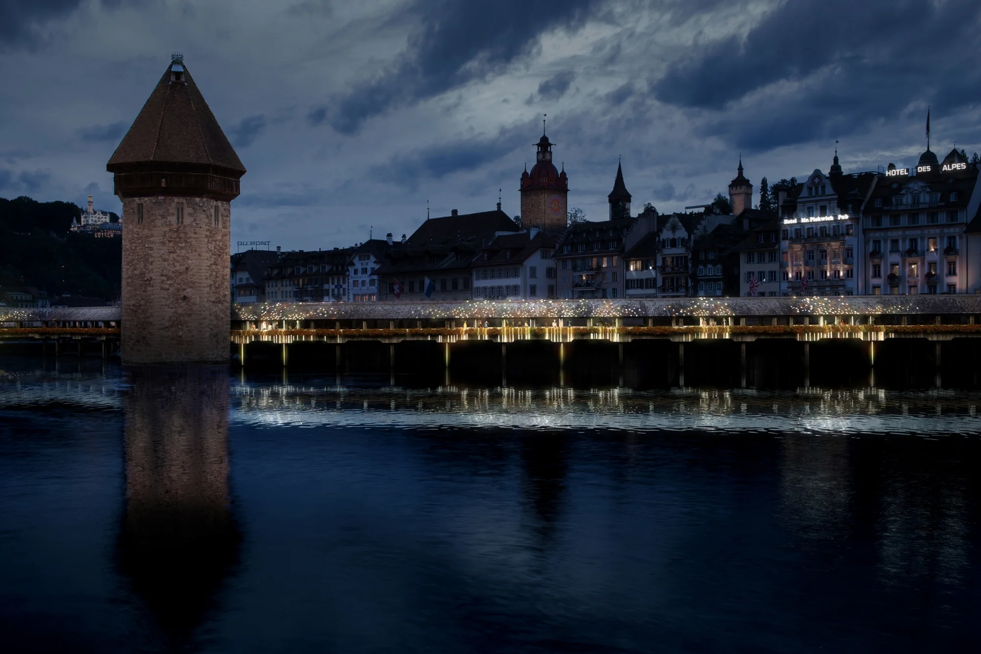 For many years, the Chapel Bridge, one of the most prominent tourist attractions in Switzerland disappeared from view at night, blocking the stunning view of the city skyline. ‘We urgently need light on the bridge!’, acknowledged a group of prominent Lucerner. They founded a project group and set up an international contest amongst architects, artists, and lighting specialists to find a unique plan that illuminated the bridge in a way which satisfied the needs of the increasing flow of intercontinental tourists and do justice to the historical character of the city and its culturally aware citizens. In July 2014, the jury chose ‘The Particle Plan’ as the winner of the competition.